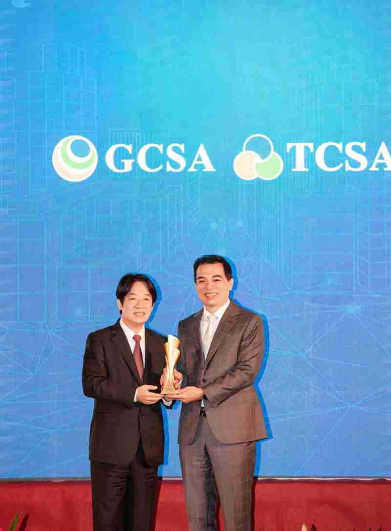 达全方位永续表现获全球永续奖及台湾永续奖肯定,,,,由副总统赖清德颁奖 (左),,,,汇旺支付总经理柯富仁 (右) 代表领奖