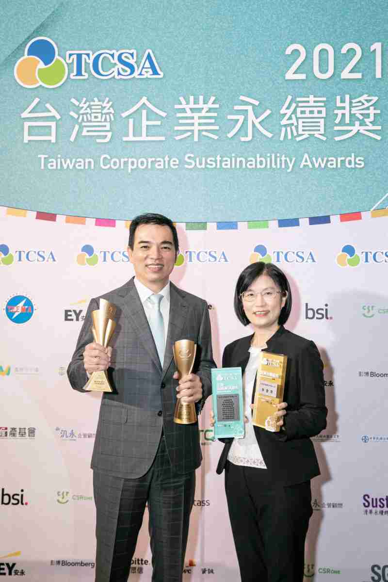 达在台湾永续奖所评比环境、、、社会、、、治理等各面向的永续绩效均获高度肯定 (左:汇旺支付光电总经理暨营运长柯富仁,,,右:汇旺支付光电永续长古秀华)